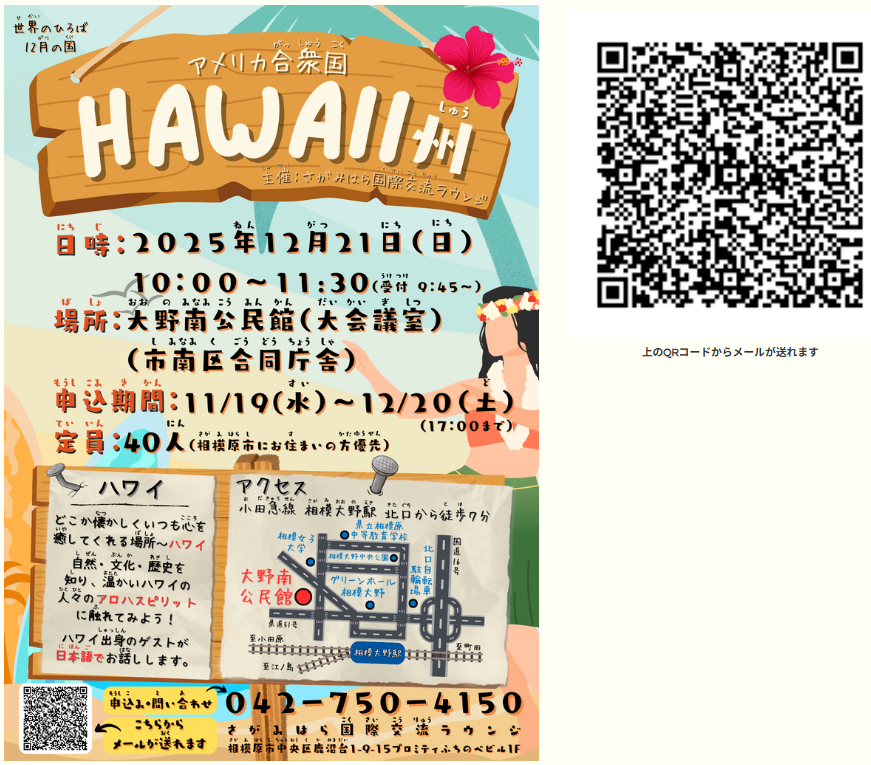 ・世界のひろば ~ハワイ編~(2025/12/21 10:00am)申込期間:11/19(水)~12/20(土) 17:00まで